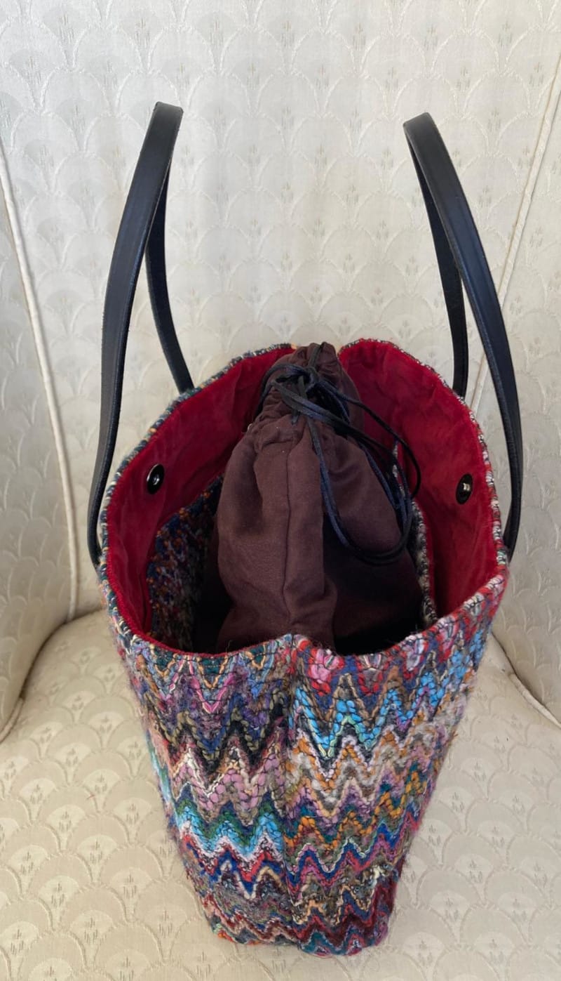 Fabric: The bag is made with Missoni fabric, featuring the brand’s iconic, colourful chevron (zig-zag) pattern. A beautiful, chunky weave. It has a faux suede drawstring pouch, which is great for keeping valuables secure or separating items inside the main bag.