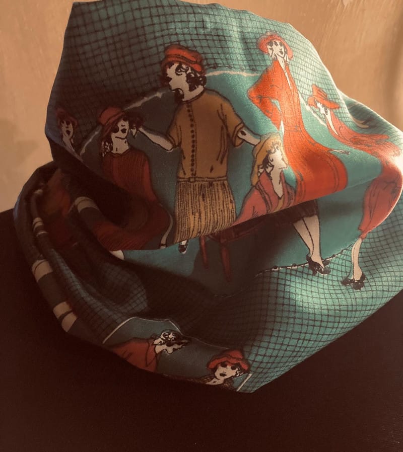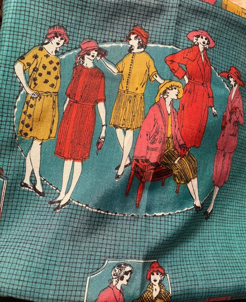 • Likely 1960s or 1970s Vintage: While the design is from the 1920s, the fabric itself—especially if silk with a novelty print like this—was often produced as a revival print in the 1960s or 1970s. These decades saw a resurgence of interest in Art Deco and the Roaring Twenties aesthetic.