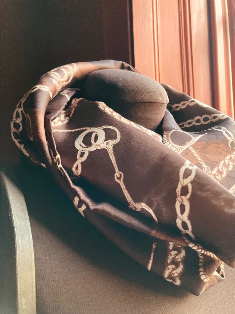 The equestrian print is a versatile pattern. This rich, dark colour would pair beautifully with a crisp white shirt, or a camel coat.