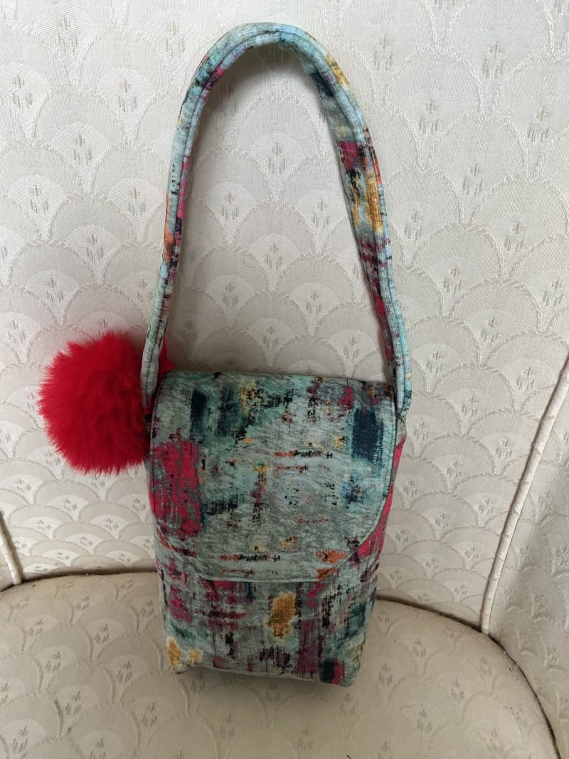 Style and Design: The bag features a long, narrow profile with a flap closure and same fabric handle.