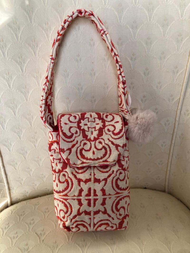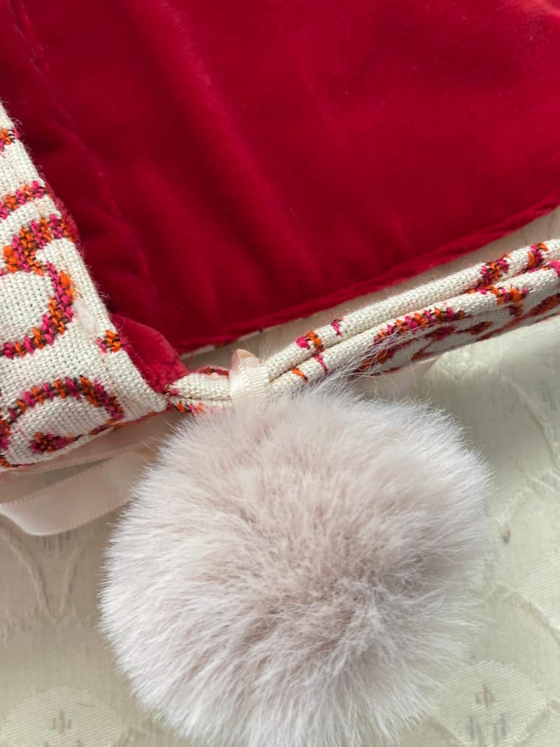 Handle: A woven top handle made from the same fabric.A prominent faux fur pom-pom is attached as a charming detail.