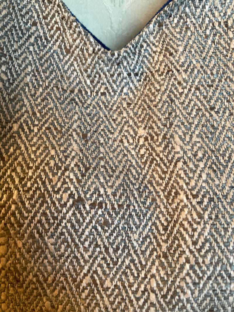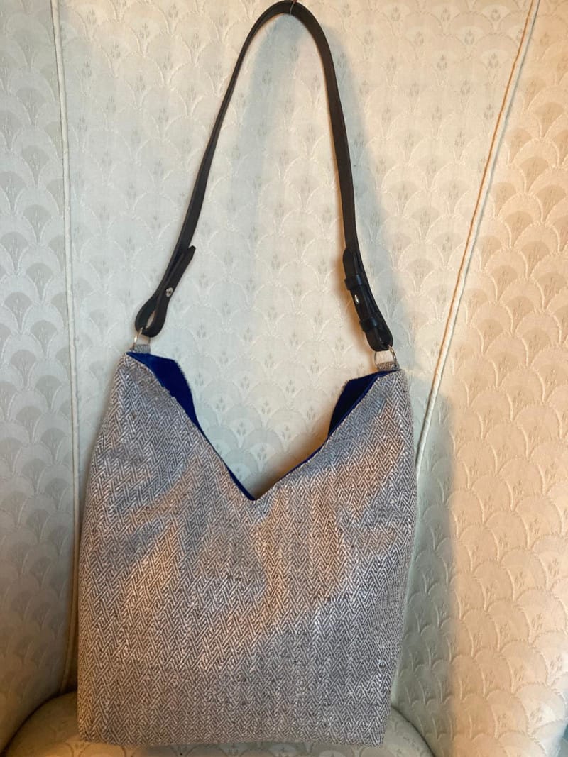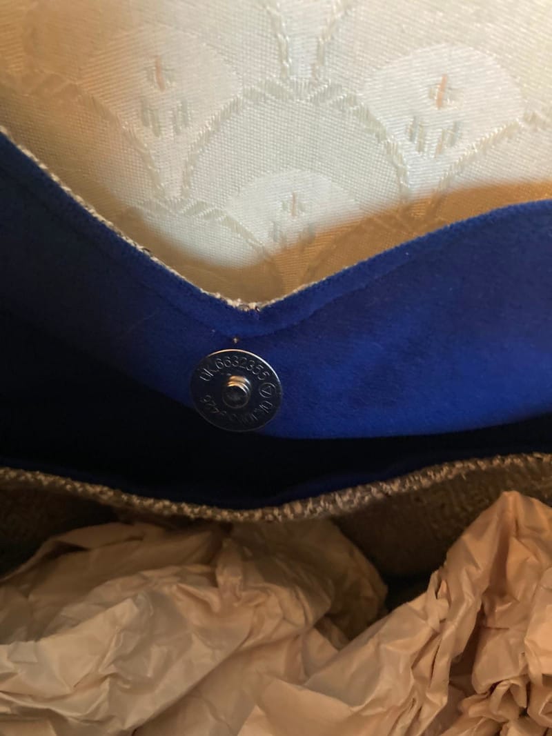 A beautiful, artisan-style bag. The combination of the rustic, woven linen exterior and vibrant blue velvet lining creates a really striking contrast!