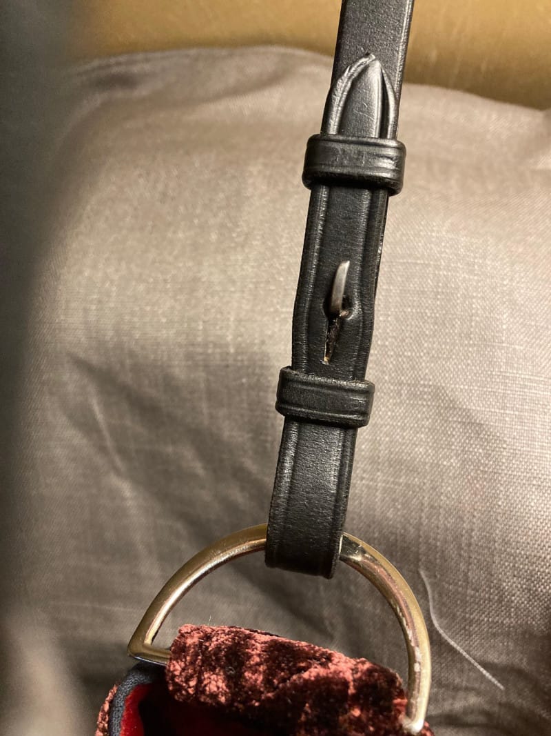 A black rein, attached with D rings. Easy to wear. It has a red wine velvet lining and one interior pocket.