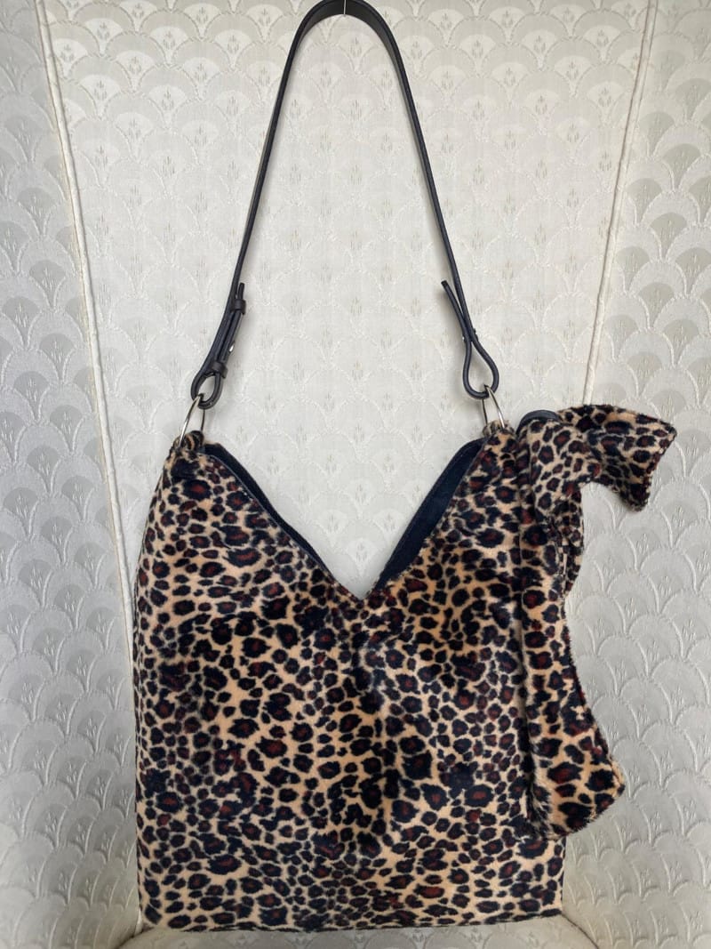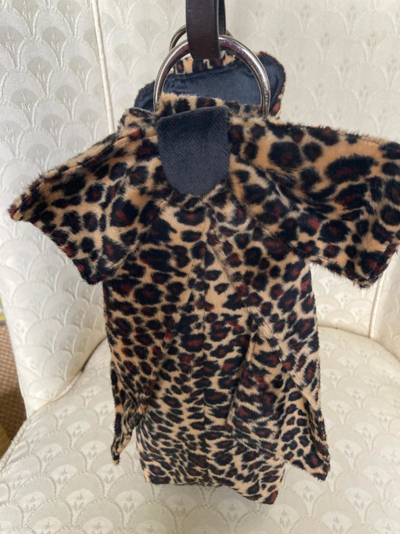 - Material: Faux fur in a leopard print pattern. A brown leather rein attached with silver-tone D rings.
